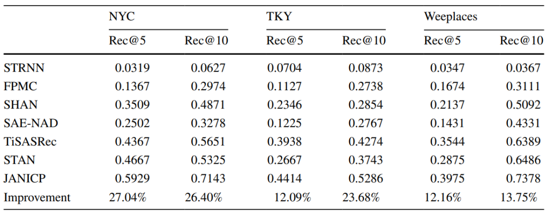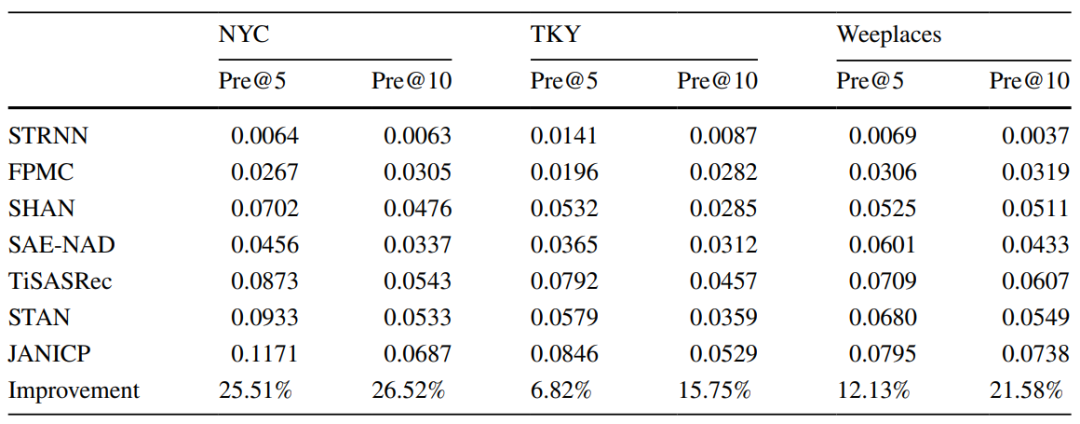 表1. 各方法在Precision@N上的性能比较在所有基线中,STRNN表现最差,因为RNN无法解决长期依赖的问题。FPMC性能不佳可能是因为它只捕捉顺序效应而忽略了时空影响。SHAN的性能优于STRNN、FPMC和SAE-NAD,它使用一个分层的注意力网络,结合了用户动态的长期和短期偏好。STAN和TiSASRec显著优于其他方法,这两种方法都考虑了时间间隔。只有JANICP充分考虑了用户的稳定偏好和上下文偏好,并充分考虑了POI类别、时间和地理影响。此外,六个基线没有考虑POI类别的影响,FPMC和SHAN没有考虑时间和空间关系的影响,这可能是性能略低于JANICP的原因。