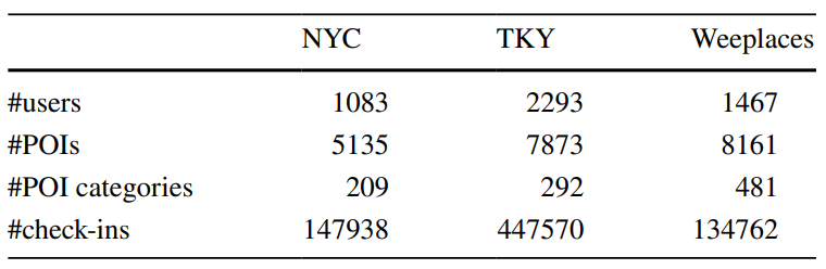 各方法在Precision@K、Recall@K方面的预测性能如表1和表2所示。表1展示了各方法在三个数据集上的precision@K比较,表2展示了各方法在三个数据集上的Recall@K比较。三个数据集NYC、TKY、Weeplaces的详细统计数据见表3。总的来说,模型在三个数据集中都比基线方法获得了更高的性能。