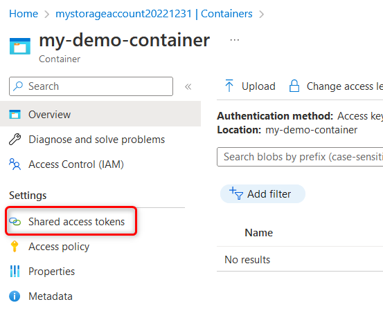 可以看到左边菜单栏Settings下面有一个Shared access tokens选项,这个就是SAS token,我们点击一下这个选项,进入创建页面: