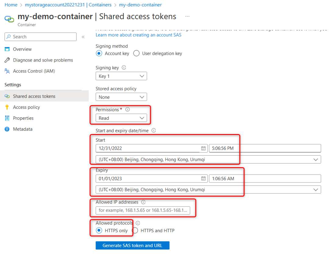 可选项。默认8个小时。可以根据自己需要更改你创建的SAS token有效期。建议定期更新,否则被人拿到就可以访问你的数据了。