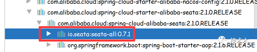 <dependency><groupId>com.alibaba.cloud</groupId><artifactId>spring-cloud-starter-alibaba-seata</artifactId></dependency>