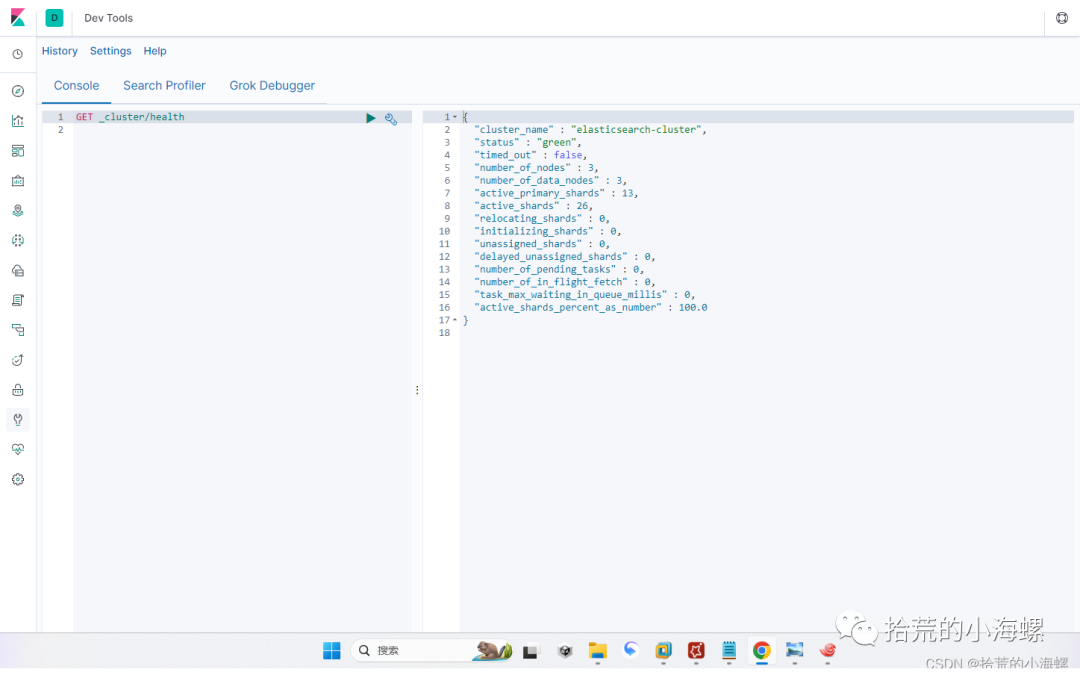 [root@localhost ~]# curl 192.168.254.129:9200/_cluster/health{"cluster_name":"elasticsearch-cluster","status":"green","timed_out":false,"number_of_nodes":3,"number_of_data_nodes":3,"active_primary_shards":13,"active_shards":26,"relocating_shards":0,"initializing_shards":0,"unassigned_shards":0,"delayed_unassigned_shards":0,"number_of_pending_tasks":0,"number_of_in_flight_fetch":0,"task_max_waiting_in_queue_millis":0,"active_shards_percent_as_number":100.0}