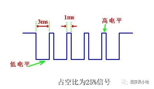 占空比就是指在一个周期内, 信号处于高电平的时间占据整个信号周期的百分比, 例如上图中所示脉冲的占空比就是25%。