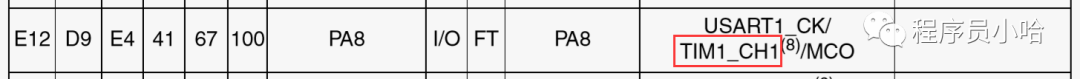 STM32单片机就是标识如下形式:TIMx_CHy这样的形式,下图中所示的PWM引脚即占用TIM1的通道1。