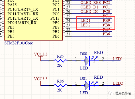 由上面的原理图可知,当LED1和LED2引脚为高电平的时候,LED灭;当引脚为低电平的时候,LED亮。