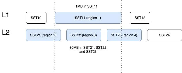 当几个 Region 具有大量的写流量时,如果它们的键范围分散,那么很可能会触发 RocksDB 中的大型压缩,其中包括其他空闲 Region 的数据。这引入了读和写扩大。例如,SST11 是一个 1MB 大小的 SST,只有 region1 的数据,但包含相当大的键范围。当它被选中合并到 L2 时,SST21、SST22 和 SST23 都参与了压缩,它们包含了 region2、3、4 的数据。TiKV 的规模越大,读写扩大越大。