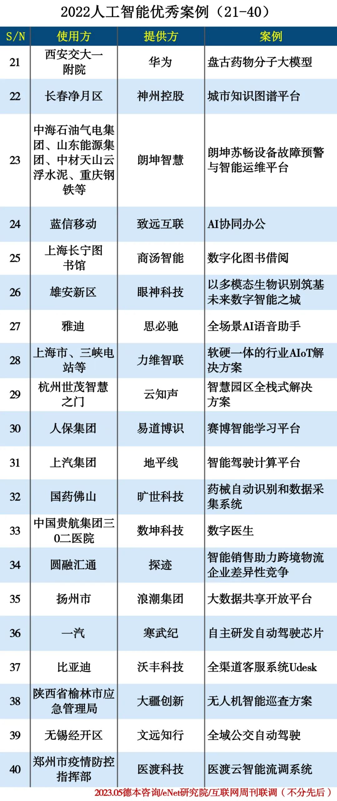 基于朗坤智慧二十余年的专业积累和坚实的技术资源,朗坤苏畅设备故障预警与智能运维平台好用、易用、实用,帮助企业实现故障早期预警、智能诊断及资产管理,广泛适用于重资产流程行业,在提高设备可靠性、降低运维成本、延长设备使用寿命、加速企业智能转型等方面带来了巨大价值。依托强大的数据管理能力、领先的设备建模平台、精准的诊断能力、丰富的软硬一体化解决方案经验、全面的企业服务能力、多维的展示终端等优势,朗坤苏畅设备故障预警与智能运维平台目前已在中海石油气电集团、山东能源集团、中材天山云浮水泥、重庆钢铁等多家头部企业高效应用。协助中海石油气电集团从事后检修到预防性维护,帮助山东能源集团达到国际先进水平,为中材天山云浮水泥装上“慧眼”与“聪耳”,使重庆钢铁“悬丝诊脉”成真。蓝信移动(北京)科技有限公司是一家专注为党政军央企等大型组织提供安全、专属、高效、全场景、智能化协同办公服务的科技公司。作为中国数智化协同运营平台及云服务领导厂商,致远互联签约蓝信移动后,基于COP协同运营平台,结合蓝信移动精细化管理诉求,将售前、销售、商务、财务等多个环节高效串联,实现业务数据全链条打通,加强各部门之间信息共享、业务联动能力,提高公司整体运营管理效率。经过此次合作数字化建设,致远互联帮助蓝信移动实现了数据的有效采集,不断细化运营管理颗粒度,保证业务数据的准确性、完整性,为领导决策提供有力支撑。2022年国庆,商汤科技与上海市长宁区图书馆共同探索打造的上海首个“智慧图书馆”——“新页书”正式向读者开放。商汤科技通过将AI技术与图书馆场景深度结合,赋能长宁图书馆的“全程”智能借还书场景,从智能交互、智能预约、智能荐书、智能送书等环节为读者提供了全流程数字化的阅读体验。AI数字人“馨叶”应用了先进的计算机视觉、自然语言处理和决策智能等技术,当读者来到面前时会被自动唤醒,并主动进行欢迎和引导服务;逼真自然的对话之外,她还能运用表情神态、手势和动作,从而大大提升了人机交互体验。通过引入为图书馆场景特制的推荐算法,她会根据大数据计算进行馆内热门图书、个性化书籍推荐,随着使用次数积累,数字人的推荐结果将逐渐优化,充分发挥场馆内每本书的价值。长宁区图书馆“新页书”支持“在馆阅读”和“自助取书”两种阅读方式。如选择“在馆阅读”,读者在预约座位并入座后,智慧阅读机器人就会带着所选书籍来到座位旁边,读者成功输入验证码后,机器人的“口袋”就会自动打开,完成书籍借阅;阅读完毕后,读者也可通过这台机器人实现便捷还书。26. 雄安新区、眼神科技:以多模态生物识别筑基未来数字智能之城作为首批签约雄安、首家将总部落户雄安的人工智能企业,眼神科技正扮演着推动未来数字经济时代新型基础设施建设的排头兵角色,目前已在雄安新区打造智慧社区、智慧消费、智慧政务、智慧校园及智慧征迁中发挥了效能,推动城市治理向“智”理升级,携手民众进入全新的智慧生活时代。眼神科技以自身多模态生物识别融合技术优势为智慧城市建设提供高安全、强隐私、超便捷的认证入口,通过对人、物、场的智能识别和数据分析,连通物理城市与数字城市,实现增强身份认证和数据治理,筑牢未来数字智能之城的基石。思必驰深耕智能车联网多年,始终秉承以用户为中心的理念,面对两轮出行智能化升级需求,打造了两轮车智能语音解决方案,赋予车辆智能交互能力。雅迪旗下高端出行品牌VFLY全新发布的流星隼N系列车型,搭载的V-SMART智能骑行系统配置了与思必驰合作开发的全场景AI语音助手,集成了思必驰全链路语音技术,实现导航、音乐、电台、电话等多类功能的语音操控。28. 上海、三峡电站等、力维智联:软硬一体的行业AIoT解决方案作为领先的AIoT产品与解决方案提供商,力维智联凭借泛在数据接入与汇聚和大数据智能等AIoT关键技术和十余年的AIoT系统集成交付能力,深耕5G动环监控与运维、城市安全应急与一网统管、新能源场站运维三大行业细分市场,提供软硬一体的行业AIoT解决方案。在电信领域,力维智联通过Sentosa数据科学与机器学习平台对运营商历史数据进行深度挖掘和分析,推出精细化节能、智能化备电管理、站点健康度评估等智能运维服务,提升监控效能,指导业务更好的决策运营和管理,助力运营商数字化、智能化转型。在城市领域,力维智联深度参与了上海等一线城市的一网统管和智慧应急系统建设。基于领先的AIoT技术,通过对物联⽹、视联⽹、数联⽹多维数据的泛在感知与深度融合,机器视觉与机器学习等数据智能技术多管⻬下,推进精细化管理,打造“感知泛在、研判多维、指挥扁平、处置⾼效”的城市治理新模式。在能源领域,力维智联通过“硬件+平台+应⽤”三维⼀体的系列产品,助⼒变电站与新能源场站管理实现⽆⼈化、智慧化,实现“降成本、保安全、增效益”的管理⽬标,为三峡等客户提供变电站智能巡视、光伏电站智能运维的产品与解决方案。29. 杭州世茂智慧之门、云知声:智慧园区全栈式解决方案杭州世茂智慧之门是择址杭州国家级新区——滨江高新区物联网小镇、斥资约88亿元打造的集写字楼、LOFT私邸、商业街区于一体的城市大型综