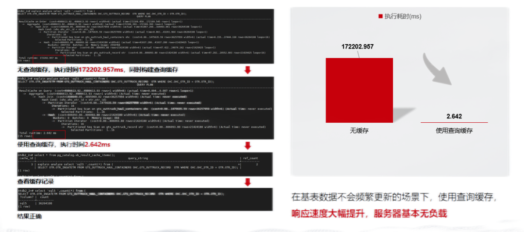 当Vastbase引用了查询缓存,对于SQL的执行仍然会保有全部的流程,并会在每一个阶段完成是否命中缓存的判断,同时通过叠加result_cache算子,在执行器阶段直接调用缓存结果集,反馈给客户端,这样可以大大避免计算、表扫描等有开销的操作,既保证了整个流程的完整性,同时又能提高效率。