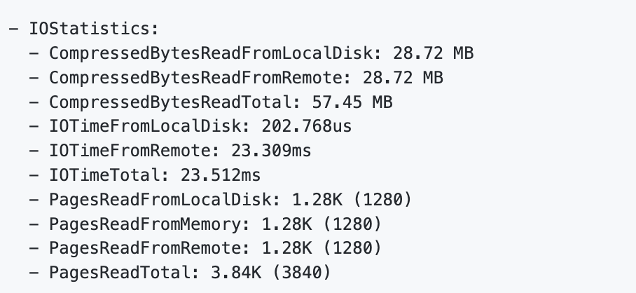 上图显示了某次查询所访问的数据部分来自后端对象存储(PagesReadFromRemote),部分来自本地磁盘缓存(PagesReadFromLocalDisk),部分来自计算节点内存缓存(PagesReadFromMemory)及各自的耗时。