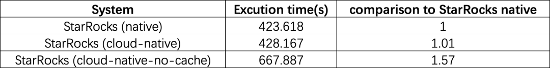 存算分离版本在缓存完全命中情况下,其总体性能已经追平存算一体(428s VS 423s)。即使在完全访问冷数据情况下,通过预读等优化手段,也很好地将冷数据查询性能衰退控制在一个合理范围内(668s VS 428s)。
