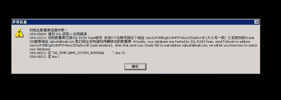 先来看勒索软件攻击Oracle数据库事件。是这样的,有用户后台使用oracle数据库的业务系统,在遭受病毒感染后,勒索软件跳出类似提示框,进行勒索,一般会有如下提示: