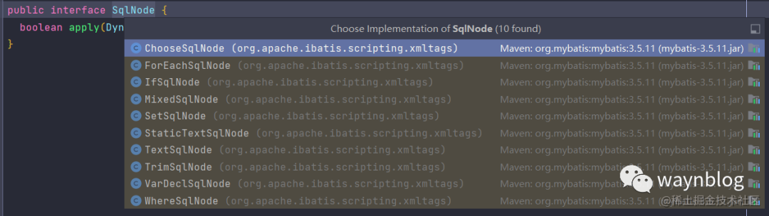 标签中包含的各个文本(包含占位符 #{} 和 ${})、子标签都有对应的 SqlNode 实现类,后续运行中, Mybatis