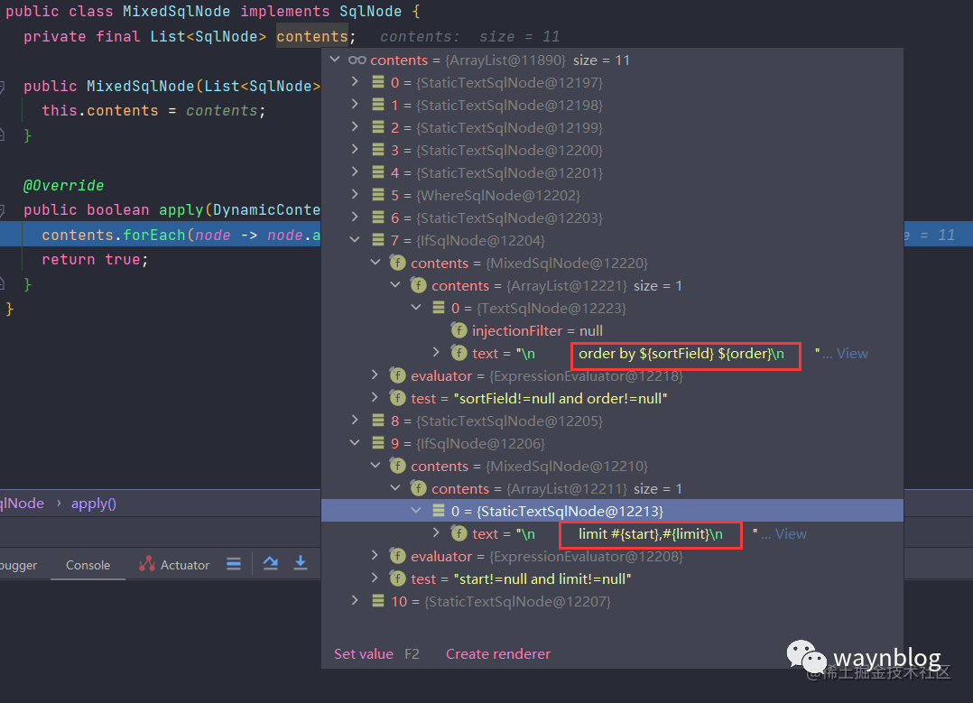 中会将 SqlNode 集合拼接成实际要执行的 sql 语句 保存在 DynamicContext 对象中。这里给出 SqlNode 集合的调试截图