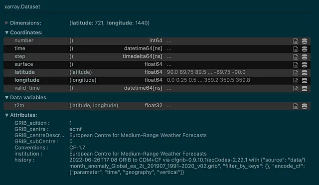 打开grib文件后,我们可以看到Dimensions、Coordinates、Data variables和Attributes。这些元素中的每一个都包含有关我们数据的有用信息。如我们所见,我们有两个维度——纬度和经度。这些维度也是我们数据的坐标——这意味着我们数据中的每个点都必须具有唯一的纬度和经度组合。坐标time、step、heightAboveGround和valid_time只有一个值——它是对我们底层DataArray中的所有元素都有效的单一信息。