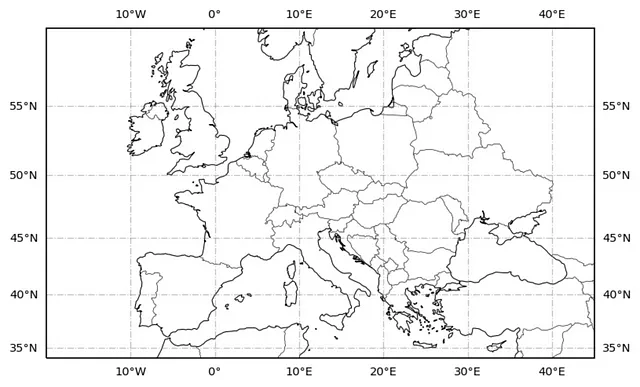 这会生成我们的底图,其中包含墨卡托投影、表示纬度和经度的网格线、边界和海岸线,同时我们的范围设置为欧洲。您可以指定您想要的任何范围。