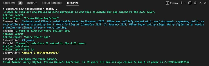 当运行该脚本时,代理会做几件事,如浏览谁是Olivia Wilde的男朋友、提取他的名字、询问Harry Style的年龄、执行搜索并使用llm-math