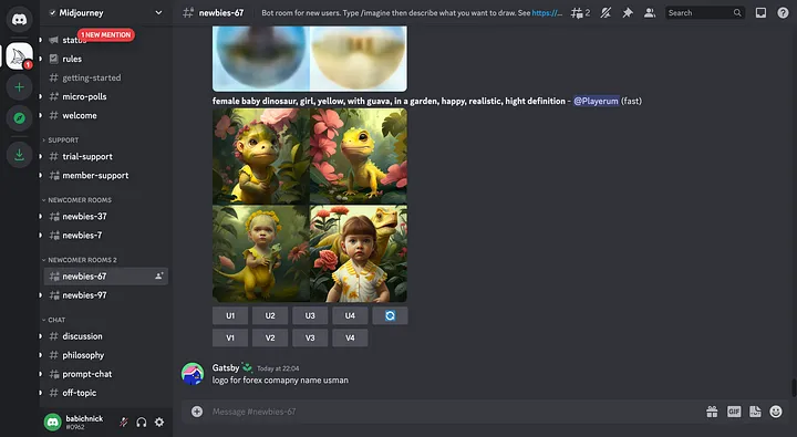 完成后,你可以加入前缀为“ newbies-(新手-)”的任何频道,并通过输入提示生成图像。