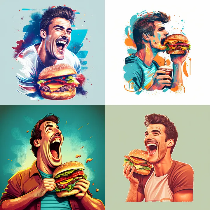 这些图像是以不同的风格生成的——从水彩画到高度逼真的照片插图。显而易见,Midjourney很难将快乐与饮食结合起来。放大第二张图片查看细节,看看放大后的版本是否会更好看。