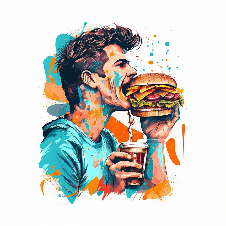/imagine happy man eating a burger, high resolution, high quality illustration