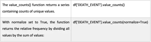 不仅目标变量具有分类性质,而且其他一些自变量也具有分类性质。我们将查看每个值的计数,以了解每个类别在数据集中的表现情况。我们将使用value_counts()函数来查找分类特征性别、贫血、高血压、糖尿病和吸烟者的频率。频率如下: