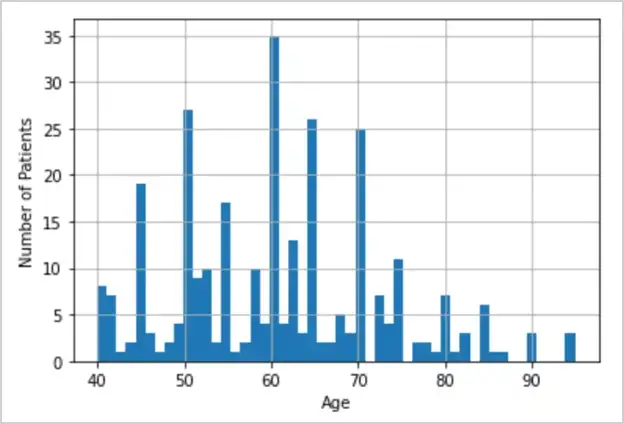 25% 的患者年龄在 50 岁以下(25% 百分位数)。 50% 的患者年龄在 60 岁以下(中位数)。 75% 的患者年龄在 70 岁以下(75% 百分位数)。