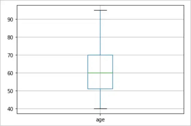 60 至 70 岁的患者数量最多。年龄从40岁到95岁不等。之后,我们还将从年龄列绘制一个箱线图: