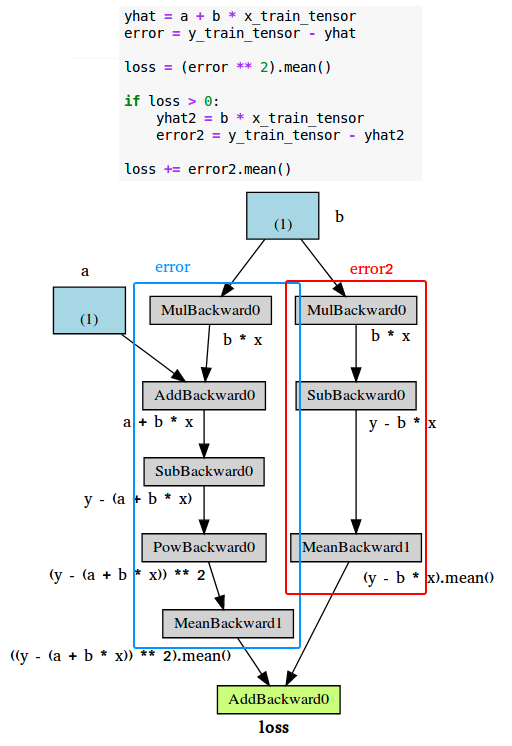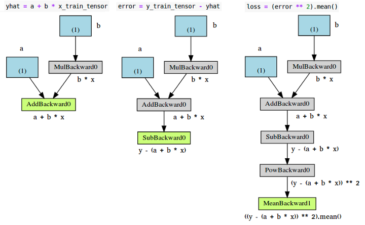# No more manual loss! # error = y_tensor - yhat # loss = (error ** 2).mean() loss = loss_fn(y_train_tensor, yhat)