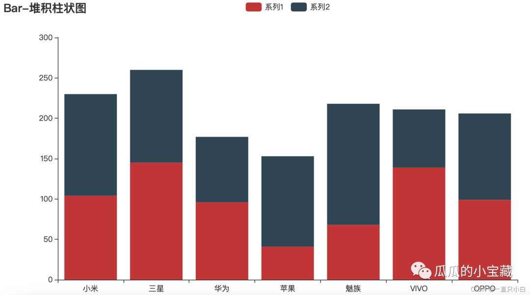 堆积柱状图与柱状图不同的地方在于 add_yaxis下的stack参数.如果两个系列stack参数参数一致则就是堆叠放置