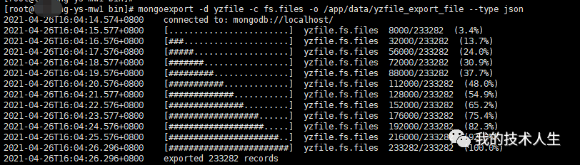 导出集合 fs.files 所有的数据, --type 可以不指定,默认就是json。
