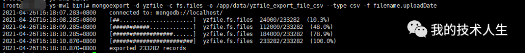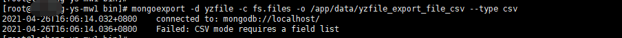 mongoexport -d yzfile -c fs.files -o app/data/yzfile_export_file_csv --type csv2021-04-26T16:06:14.032+0800 connected to: mongodb://localhost/2021-04-26T16:06:14.036+0800 Failed: CSV mode requires a field list