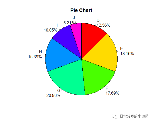 cex = 1,radius = 1, clockwise = TRUE, col = rainbow(7), main = "Pie Chart")