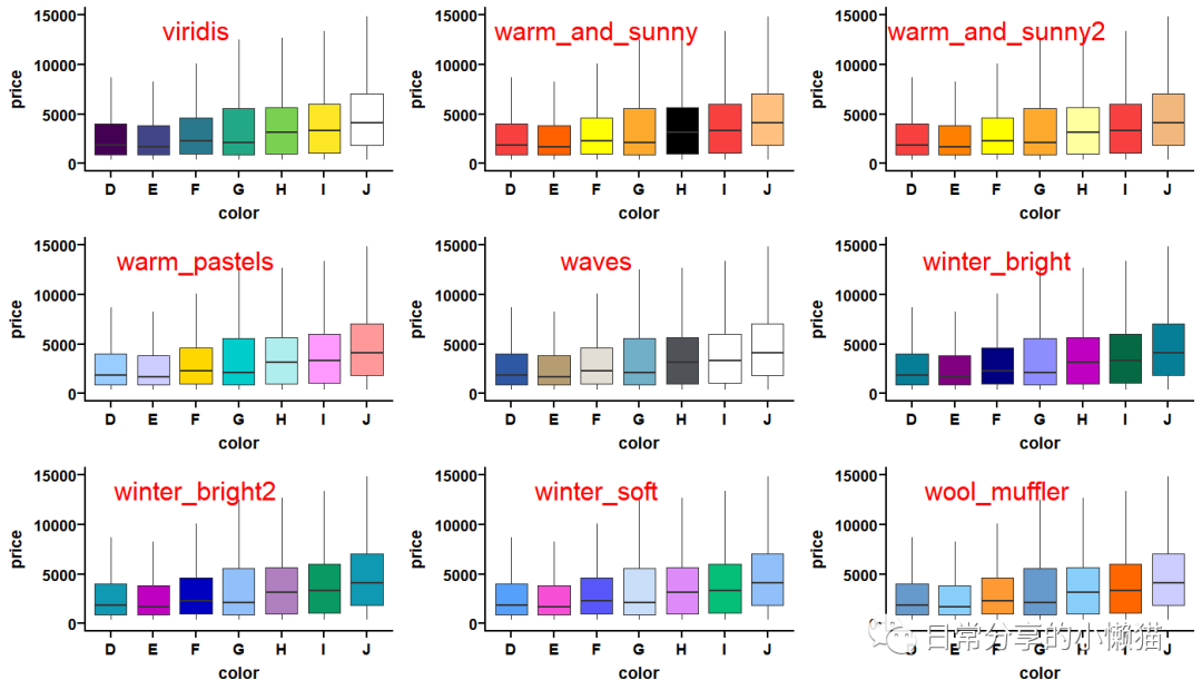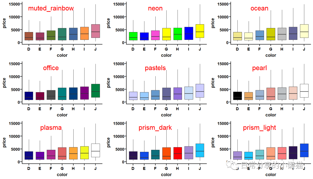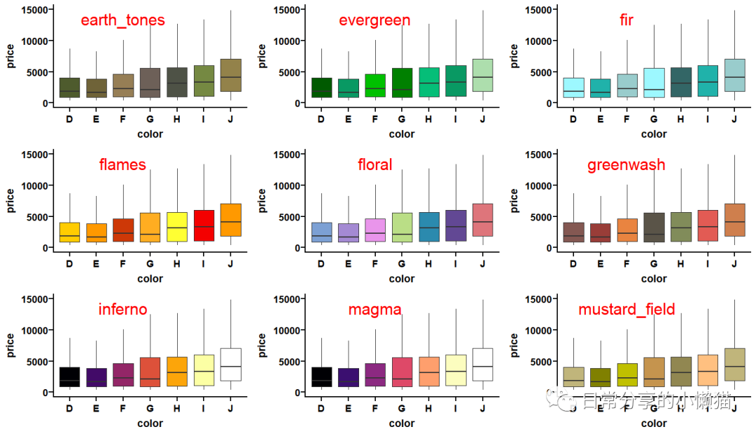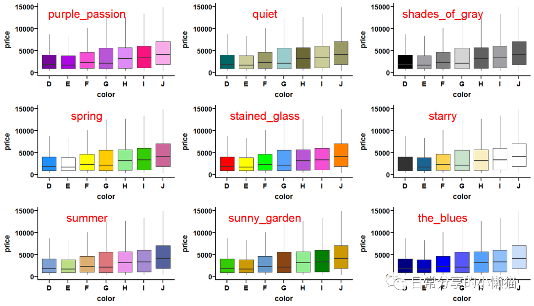 利用diamonds数据集,绘制不同颜色分组下钻石价格的箱线图,分别进行45种颜色的填充。
