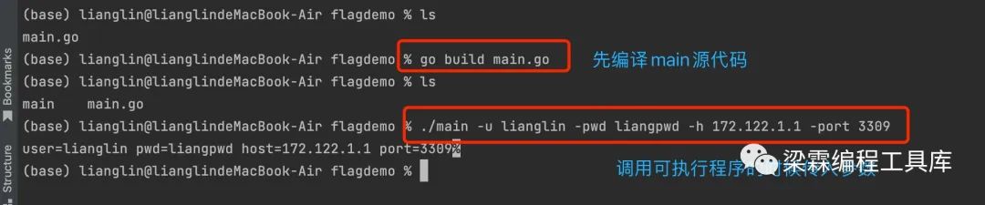 package mainimport ("fmt""flag")func main() {//定义几个变量,用于接收命令行的参数值var user stringvar pwd stringvar host stringvar port int//&user 就是接收用户命令行中输入的 -u 后面的参数值//"u" ,就是 -u 指定参数//"" , 默认值//"用户名,默认为空" 说明flag.StringVar(&user, "u", "", "用户名,默认为空")flag.StringVar(&pwd, "pwd", "", "密码,默认为空")flag.StringVar(&host, "h", "localhost", "主机名,默认为localhost")flag.IntVar(&port, "port", 3306, "端口号,默认为3306")//这里有一个非常重要的操作,转换, 必须调用该方法flag.Parse()//输出结果fmt.Printf("user=%v pwd=%v host=%v port=%v",user, pwd, host, port)}