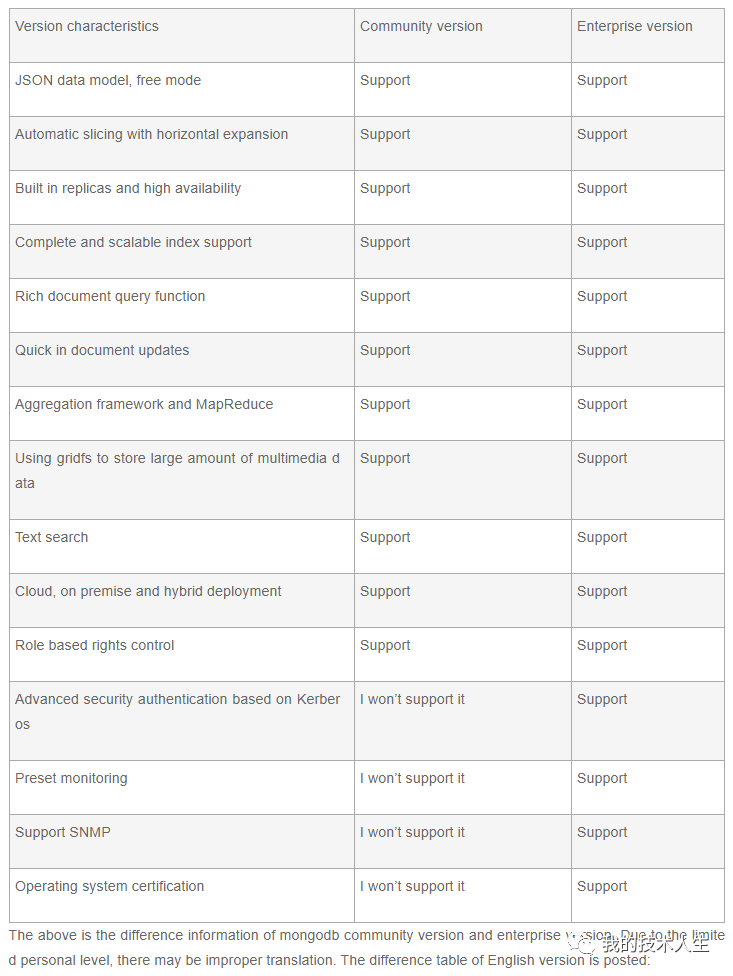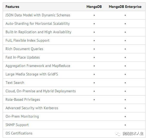 从中可以看出两者相差不是很大,这对于一般企业应用来说的话,社区版足够用了。但是如果公司对MongoDB这块性能、安全性有较高要求的话,建议用企业版的。