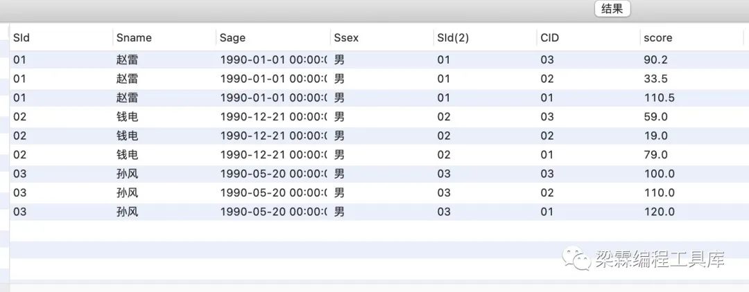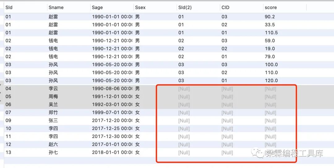 select *from student,scwhere student.sid = sc.sid;