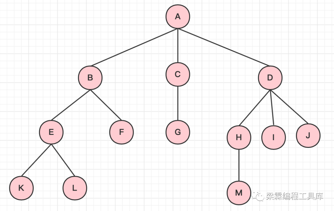 叶子节点:指的是没有子树的节点叫做树的叶子节点,比如下图中的K、L、F、G、M、I、J