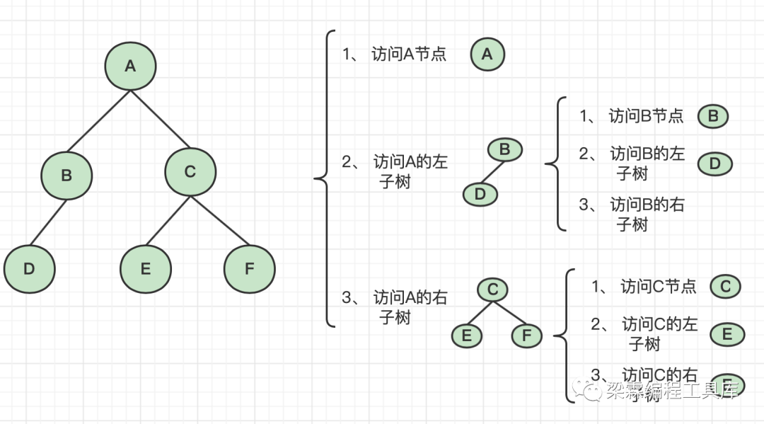 public class Main {public static void main(String[] args) {BTNode root = create();preOrder(root);}public static void preOrder(BTNode root){if(root == null){return;}System.out.println(root);//递归调用左边preOrder(root.left);//递归调用右边preOrder(root.right);}public static BTNode create(){BTNode a = new BTNode(0,"A");BTNode b = new BTNode(1,"B");BTNode c = new BTNode(2,"C");BTNode d = new BTNode(3,"D");BTNode e = new BTNode(4,"E");BTNode f = new BTNode(5,"F");a.left = b;a.right = c;b.left = d;c.left = e;c.right = f;return a;}}