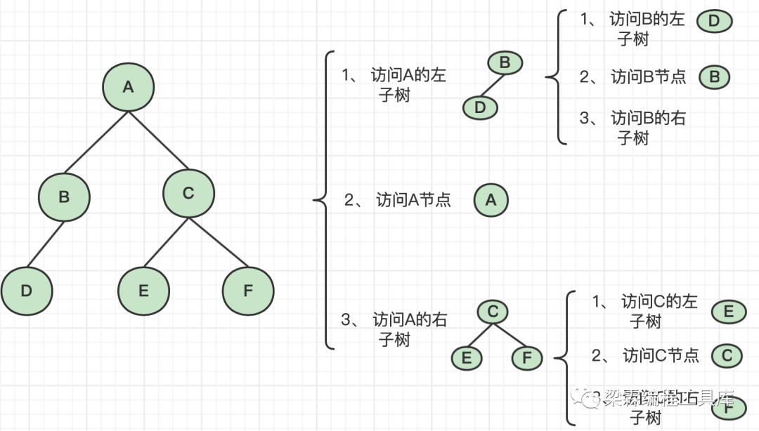 中序遍历的遍历顺序是先访问左子树,然后访问根,最后访问右子树的过程。