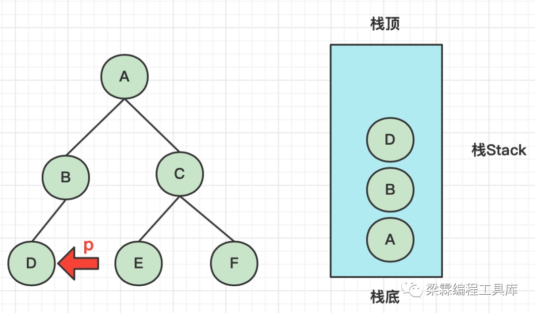 public class Main2 {public static void main(String[] args) {BTNode root = create();inOrderNoCur(root);}public static void inOrderNoCur(BTNode root){if(root == null){return;}Stack<BTNode> stack = new Stack<>();BTNode p = root;while(p!=null || !stack.empty()){if(p!=null){stack.push(p);p = p.left;}else{p = stack.pop();System.out.println(p);p = p.right;}}}public static BTNode create(){BTNode a = new BTNode(0,"A");BTNode b = new BTNode(1,"B");BTNode c = new BTNode(2,"C");BTNode d = new BTNode(3,"D");BTNode e = new BTNode(4,"E");BTNode f = new BTNode(5,"F");a.left = b;a.right = c;b.left = d;c.left = e;c.right = f;return a;}}