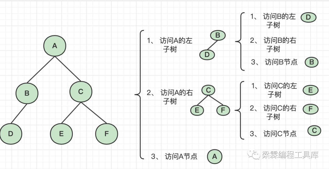 public class Main {public static void main(String[] args) {BTNode root = create();postOrder(root);}public static void postOrder(BTNode root){if(root == null){return;}postOrder(root.left);postOrder(root.right);System.out.println(root);}public static BTNode create(){BTNode a = new BTNode(0,"A");BTNode b = new BTNode(1,"B");BTNode c = new BTNode(2,"C");BTNode d = new BTNode(3,"D");BTNode e = new BTNode(4,"E");BTNode f = new BTNode(5,"F");a.left = b;a.right = c;b.left = d;c.left = e;c.right = f;return a;}}