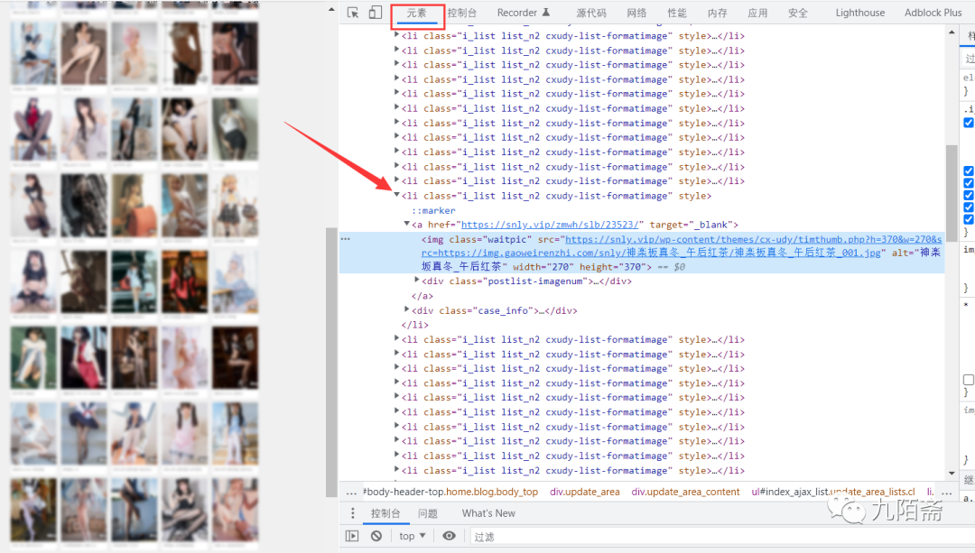 继续F12,查看元素,就能发现是一个又一个的li标签了,每个li可以点击进入到对应主题的图片详情界面,得到了这个信息就简单了,就很好获取详情页的url了。