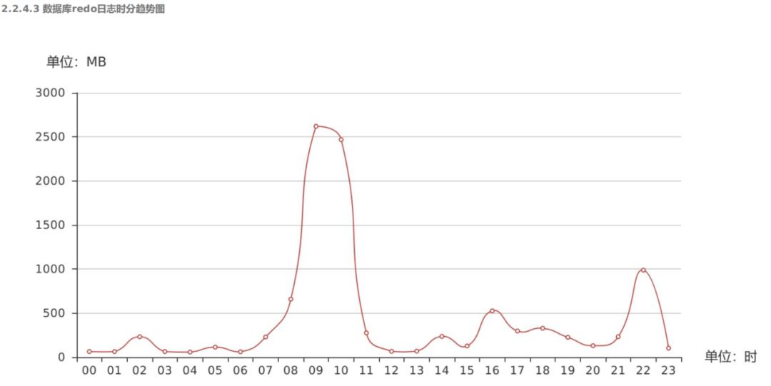 每套数据库都有其特定的运行规律,为了避免局限性,数据库巡检不能只是检查瞬时指标,还需要考虑其历史运行规律,进而判断各项指标、系统运行节奏是否合理。如:从数据库redo日志时分趋势图中可以看出数据库早上9点到10点明显存在运行高峰: