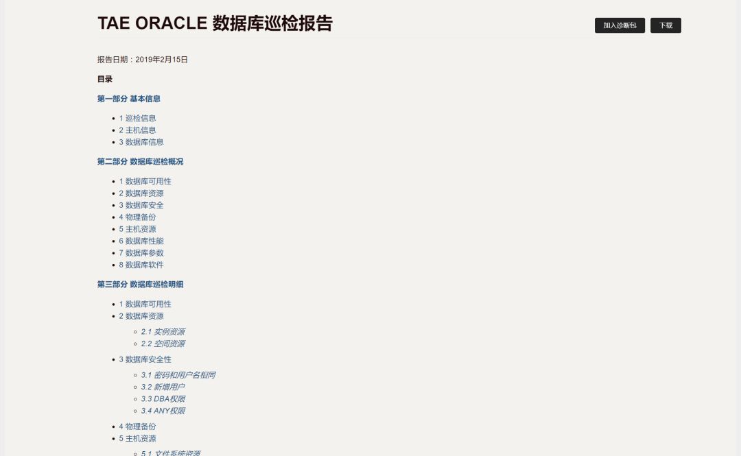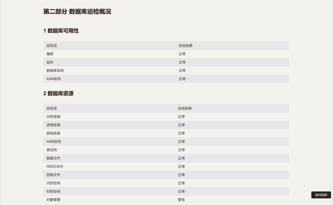 1、全面巡检,系统巡检数据库各项组件。通过全面巡检可以清楚地知道数据库健康状态、运行节奏、配置情况等信息,自动生成的全面巡检报告。如下图所示: