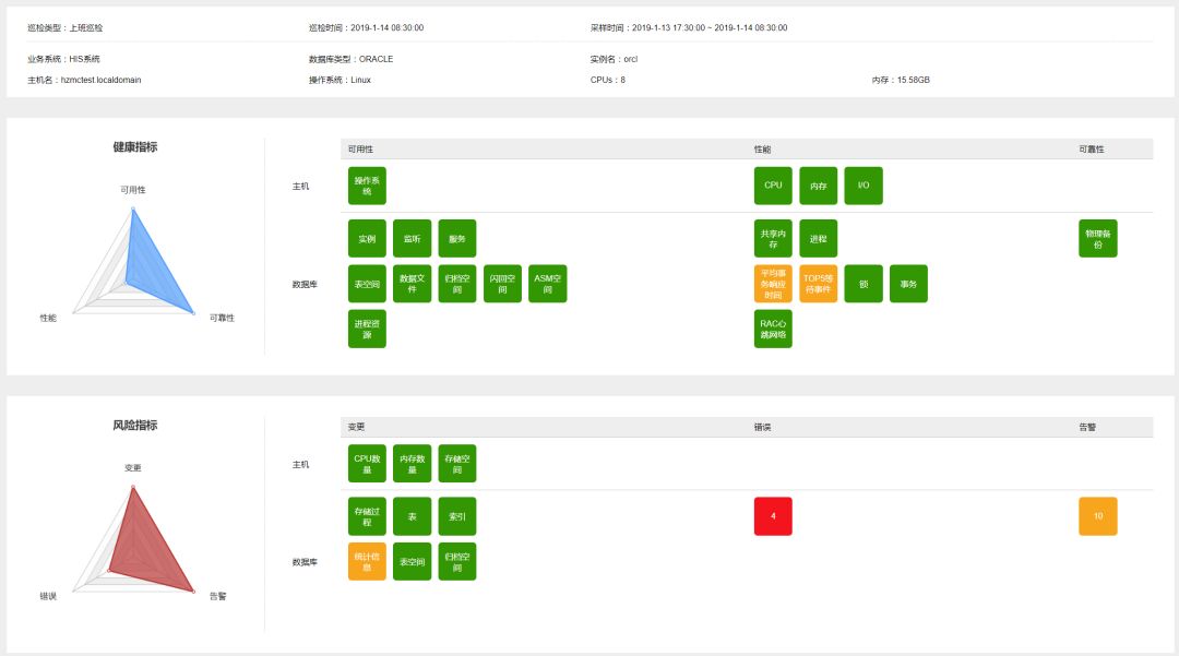 2、上班巡检,侧重巡检数据库各项组件是否处于健康状态,各项资源是否足够满足一天的业务需求。通过雷达图(健康指标和风险指标)结合红、黄、绿版块直观展示巡检概况,如下图所示: