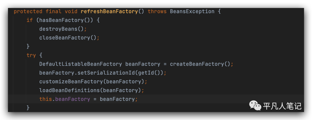 obtainFreshBeanFactory.refreshBeanFactory,这个方法里面,先判断容器里面有没有bean工厂,如果有的话,销毁掉,如果没有的话,先创建一个bean工厂,因为需要先有bean工厂之后,才能完成当前对象的加载工作。
