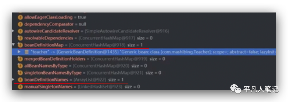 当完成创建工作之后,第二步loadBeanDefinitions是加载配置文件,因为这个配置文件中有1个bean,所以当执行完这样的加载工作之后,beanDefinitionMap和beanDefinitionNames里面有一个bean,