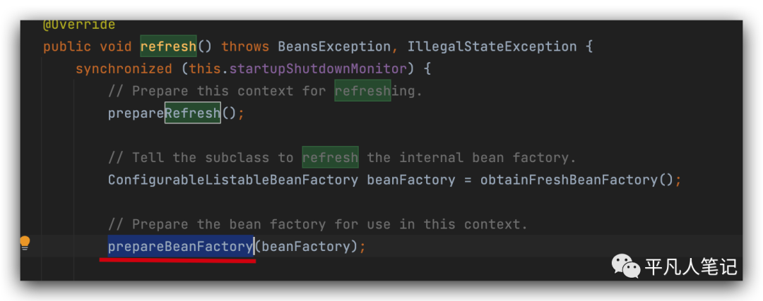 prepareBeanFactory给beanfactory做准备工作,因为刚刚new了一个对象,还没有给beanFactory做任何属性赋值操作,这个方法就是给beanFactory做一些初始化工作即给当前的beanFactory设置某些具体的属性值。