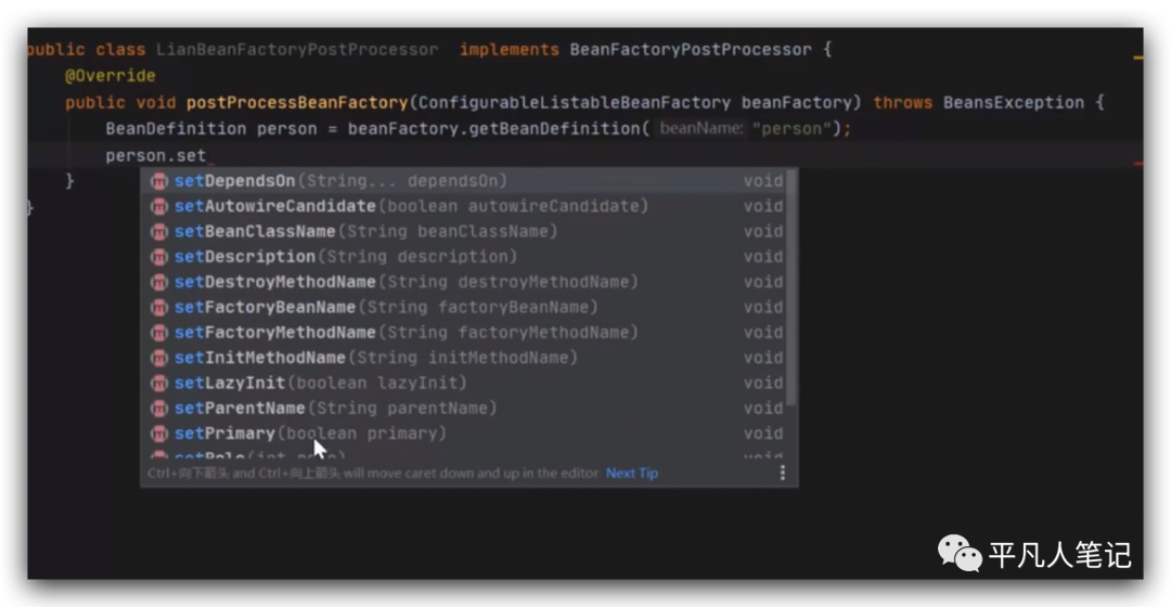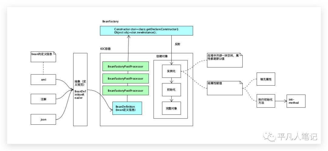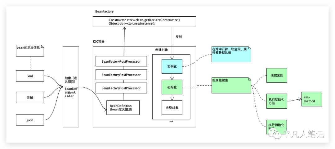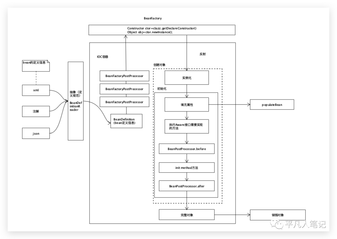 在BeanDefinition和BeanFactory之间还会经过一些beanFactoryPostProcessor方法,该方法的作用是转换BeanDefinition中的属性值,