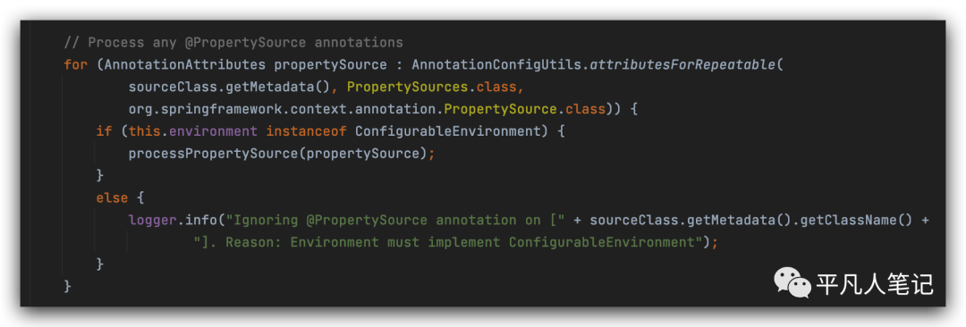 判断类上有没有@PropertySource注解,有的话,进行相应的解析和处理,进而完成一个具体的解析操作,所以这里可以进行扩展,自己需要的时候,就可以进行一些基础的相关扩展工作,但关键点是你要对它整体的执行流程和执行机制比较清楚并且可以修改源码。