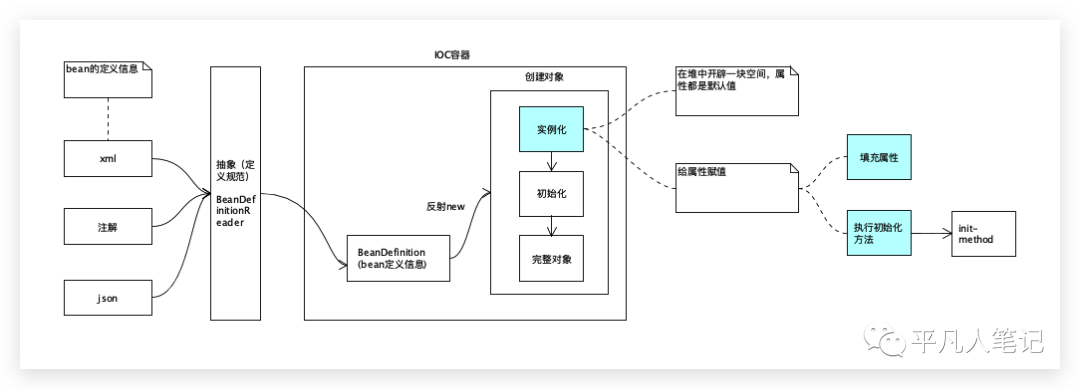 当还需要一些其他的配置文件的时候,只需要创建具体的子类实现这个接口进行解析就可以了,解析完之后,有一个统一的出口都放到BeanDefinition中去,就相当于提前做了一个抽象,这层抽象来完成具体对应的一个功能,此时已经有了bean的定义信息了,下一步就要把当前这个bean进行一些实例化工作,